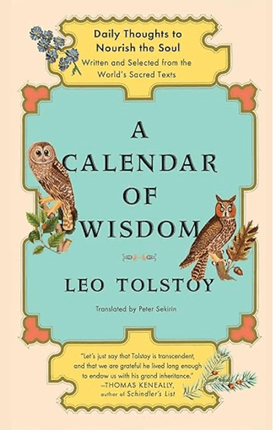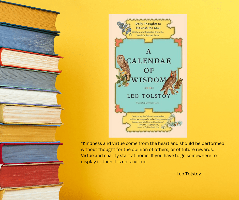 Leo Tolstoy was a Russian writer who lived in the 1800’s. He wrote two famous works, War and Peace and Anna Karenina. His work explored love, faith, war, and everyday life. His works influenced many writers and social leaders. He also wrote “A Calendar of Wisdom,” a collection of ideas and quotes from the Bible, the Koran, the Talmud, Greek philosophy, and Buddhist teachings, along with reflections from great thinkers such as Marcus Aurelius. Because it is laid out as a day-by-day calendar, a person could read this as a daily meditation. But I couldn’t resist. I read it cover to cover but will refer back to it periodically.
