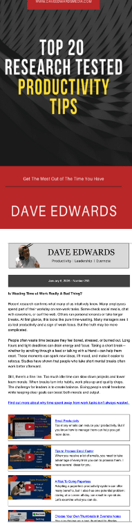 I’d love to send you a copy of my free e-book, “The Top 20 Research-Tested Productivity Tips,” and sign you up for my weekly newsletter. The newsletter, which focuses on productivity, Evernote, GTD, and leadership, is emailed most Tuesdays.