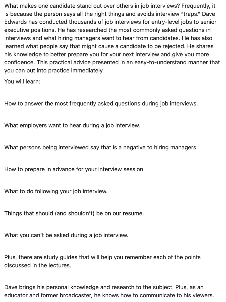 “Job Interviews: What Employers Want To Hear” is an online course where Dave walks you through the top questions and offers advice on how to frame your answers.